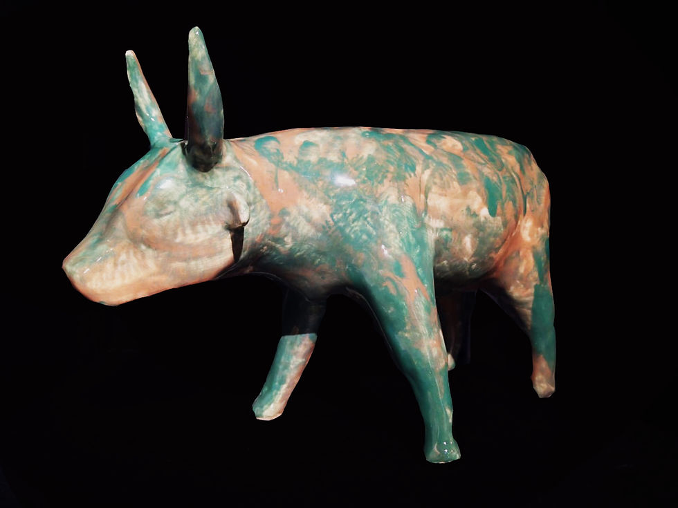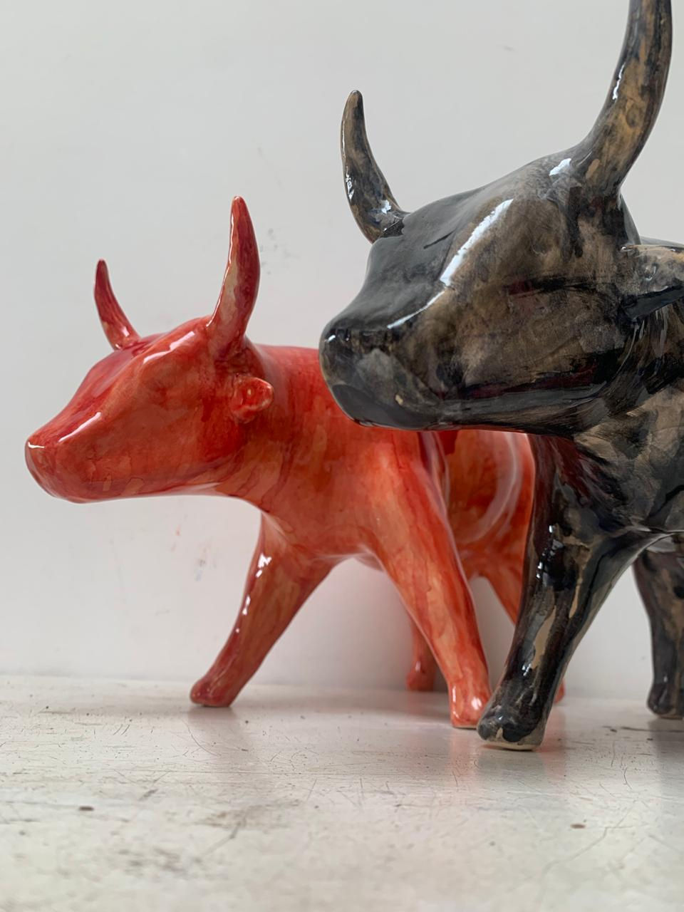 A fantastic exploration in the art of ceramics. This collection was about creating bulls which are representative animals in the artist's culture. Abstract shapes and bright colors are being shown on the bull's surface.